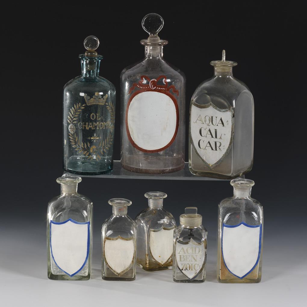 Verschiedene Flaschen, davon 1x mit gravierten Blattranken und Bezeichnung und 7x mit emailgemalten Schildern. 4 Flaschen mit teils ergänzten Stopfen, 4 Flaschen ohne Stopfen.
