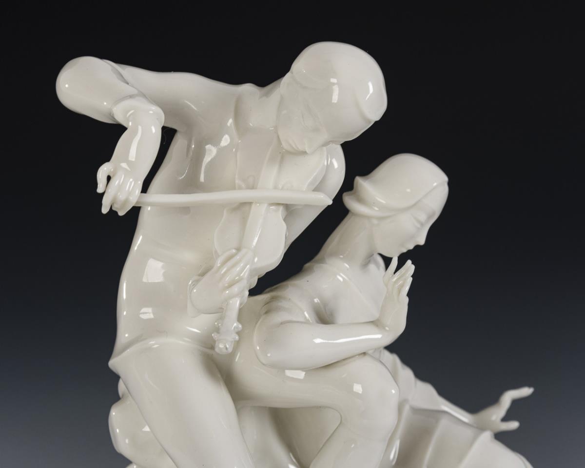 Auf einem Ovalsockel sitzendes junges Paar, der Mann eine Violine spielend. Violinenkopf restauriert.