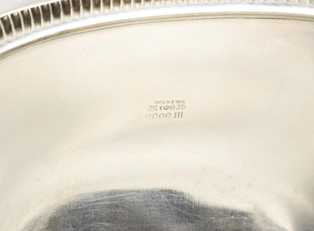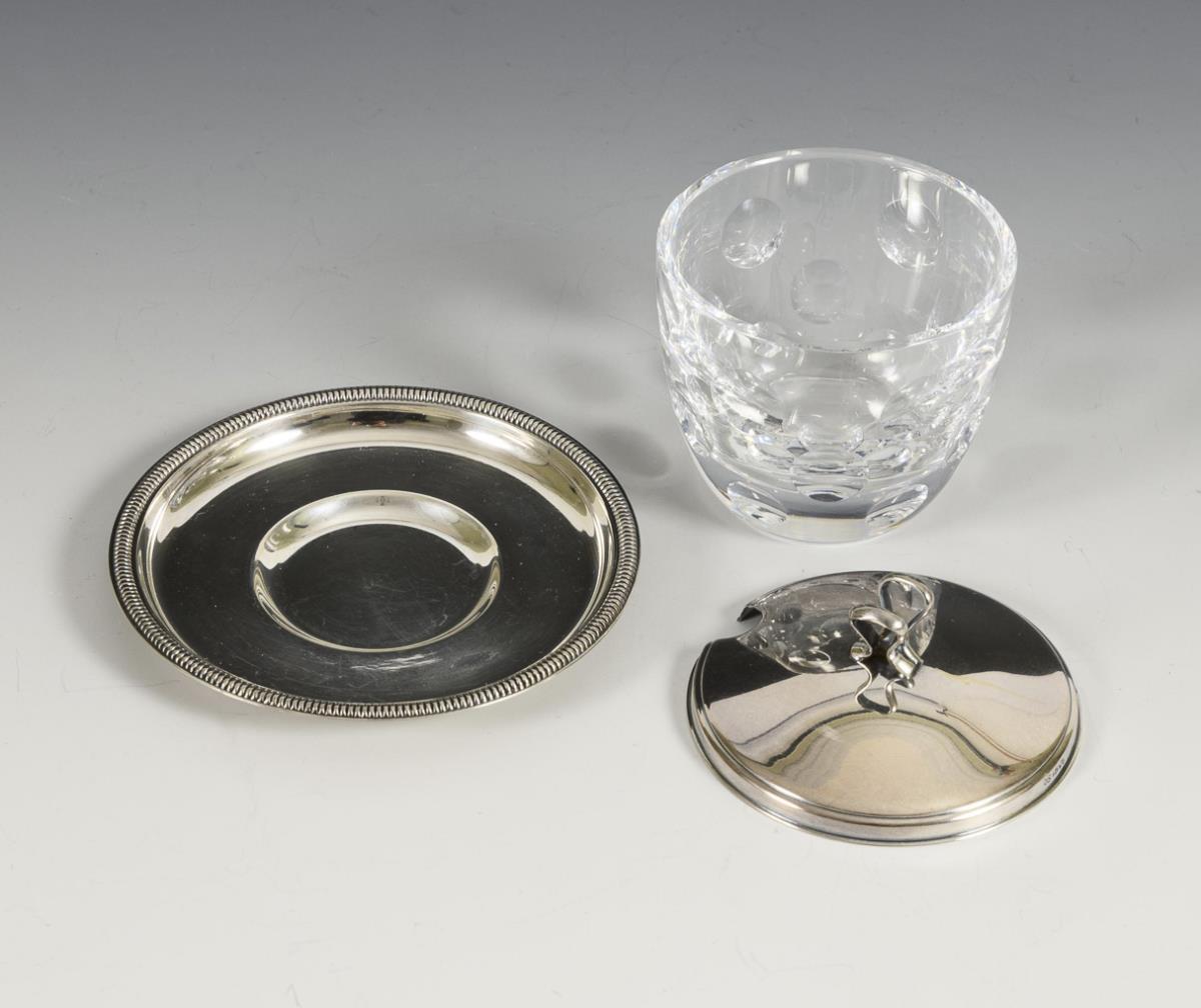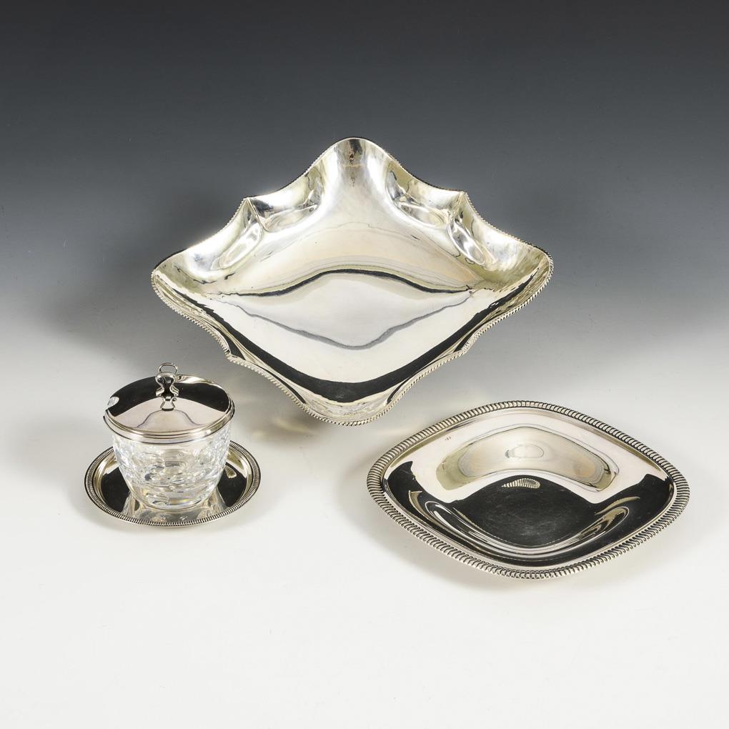 Quadratische Schale mit Kordelrand (5 x 20 x 20 cm), Quadratteller mit geripptem Rand (2 x 16,5 x 16,5 cm), gläsernes Marmeladengefäß mit silbernem Unterteller und Silberdeckel (H 8,5 cm, Ø 10,2 cm). Schale mit minimalen Gebrauchsspuren.