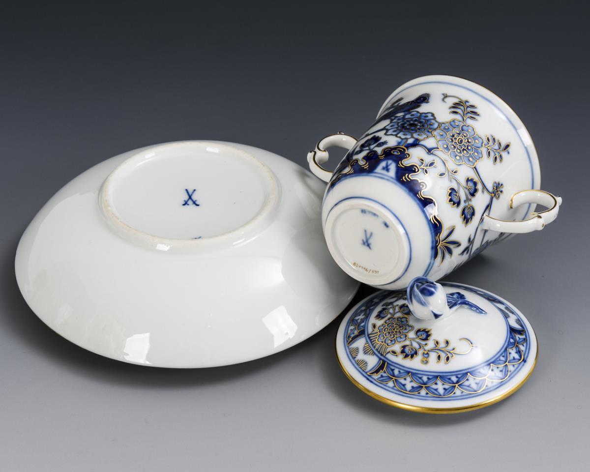 Unterglasurblaue Malerei, Goldstaffage. Tasse (H 7,5 cm), Untertasse (Ø 14 cm).