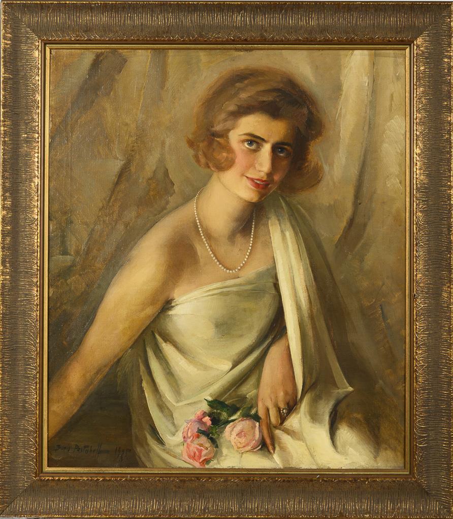 Porträt einer jungen Frau im weißen Kleid mit Perlenkette und Rosenstrauß. Eine kleine restaurierte Stelle.