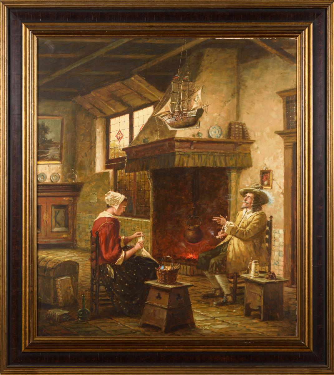 Paar in der Kleidung des 17. Jahrhunderts am brennenden Kamin in der Stube.