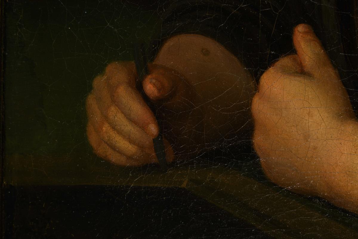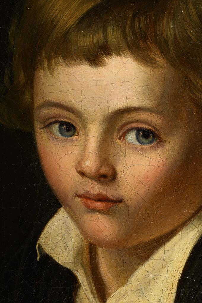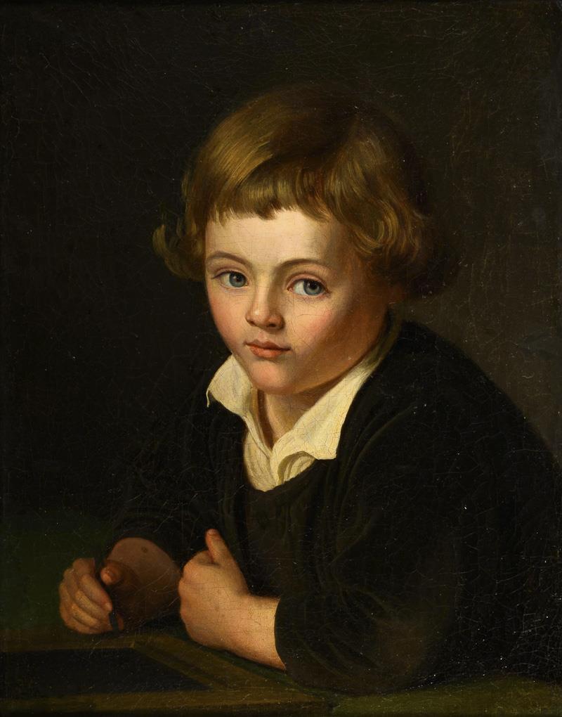 Porträt eines Jungen beim Schreiben auf der Schiefertafel. Altersspuren.