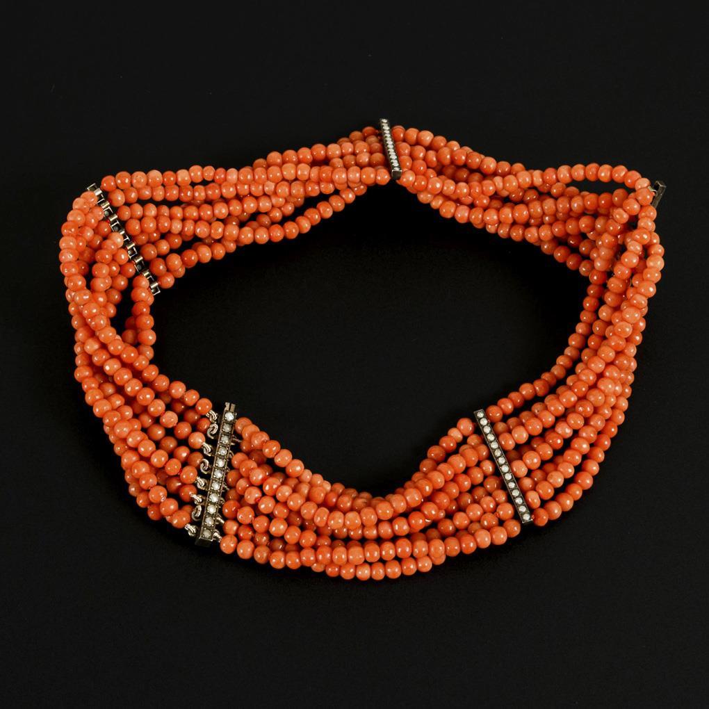 8 Schnürketten mit kleinen Korallenkugeln und 5 Zierstege mit eingelassenen Perlchen. Steckschließe.