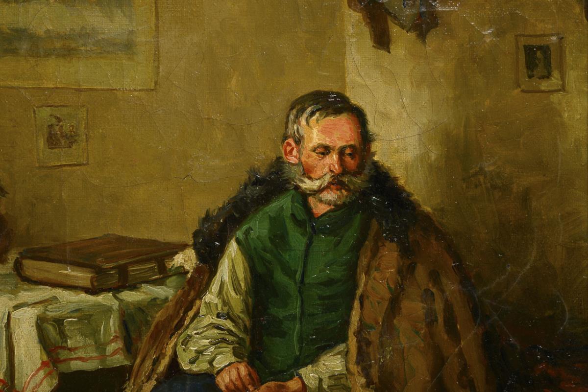 Älterer Mann mit Pelzmantel in der Stube neben Hahn und Hund. Leinwand wachsdoubliert.