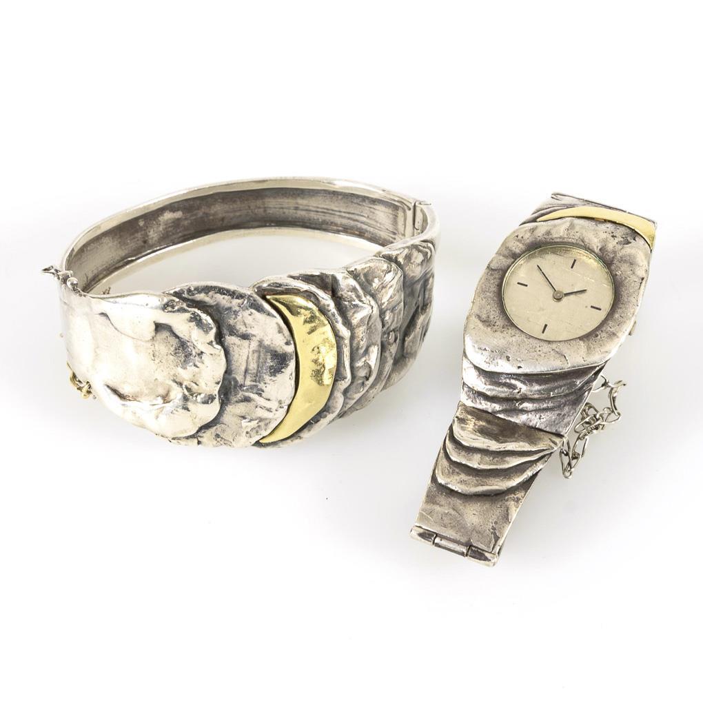 Silber 835 gestempelt. Gelbgoldsegmente 585 geprüft. Armbanduhr 17 cm. Armreif Ø 6,5 cm. 51,9/61,6 g.