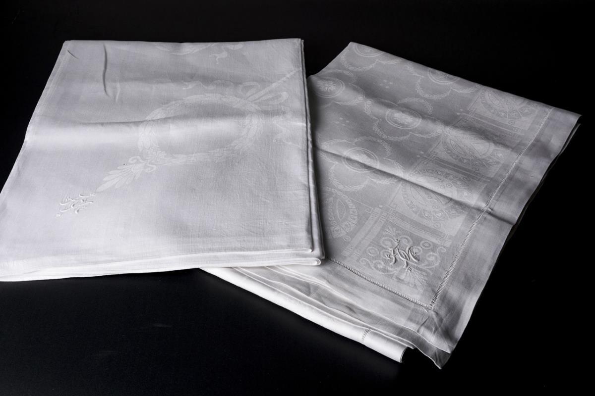 Tuch mit schleifenbekrönten Lorbeerkränzen. Tuch mit verschiedenen Kranzornamenten und Hohlsaum. Weißstickerei-Monogramm AM.