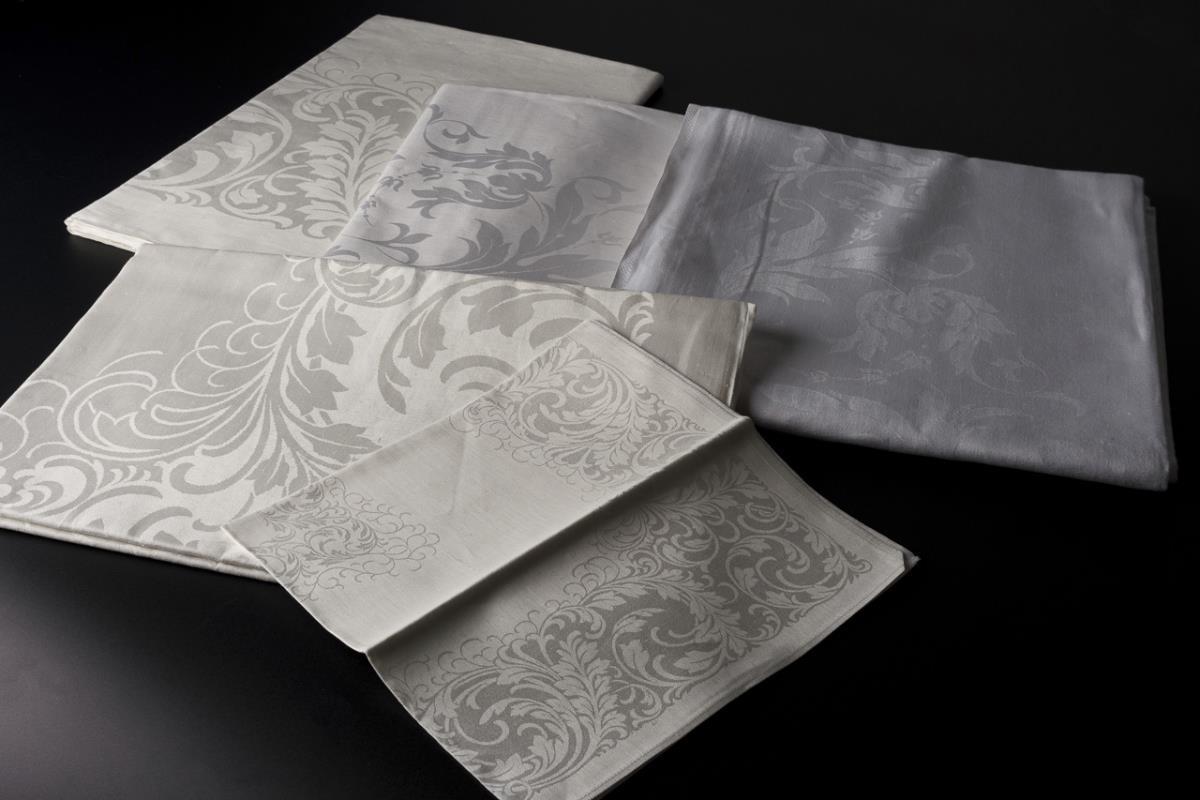 3 Tafeltücher, 1 Tischtuch und 32 Servietten mit Akanthusdekoren. Teilweise unbenutzt.