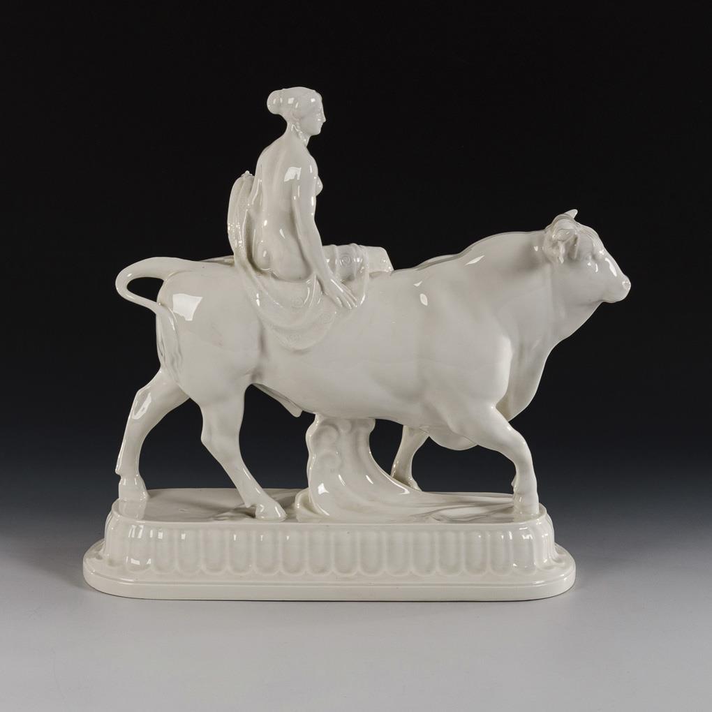 Plastik der als Europa auf dem Stier gestalteten Braut aus der Serie des "Hochzeitszuges". Brandriss im rechten Vorderbein des Stieres.