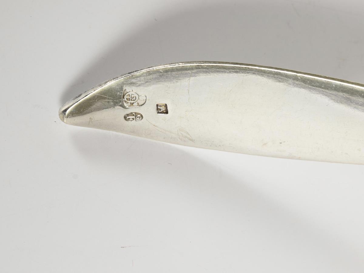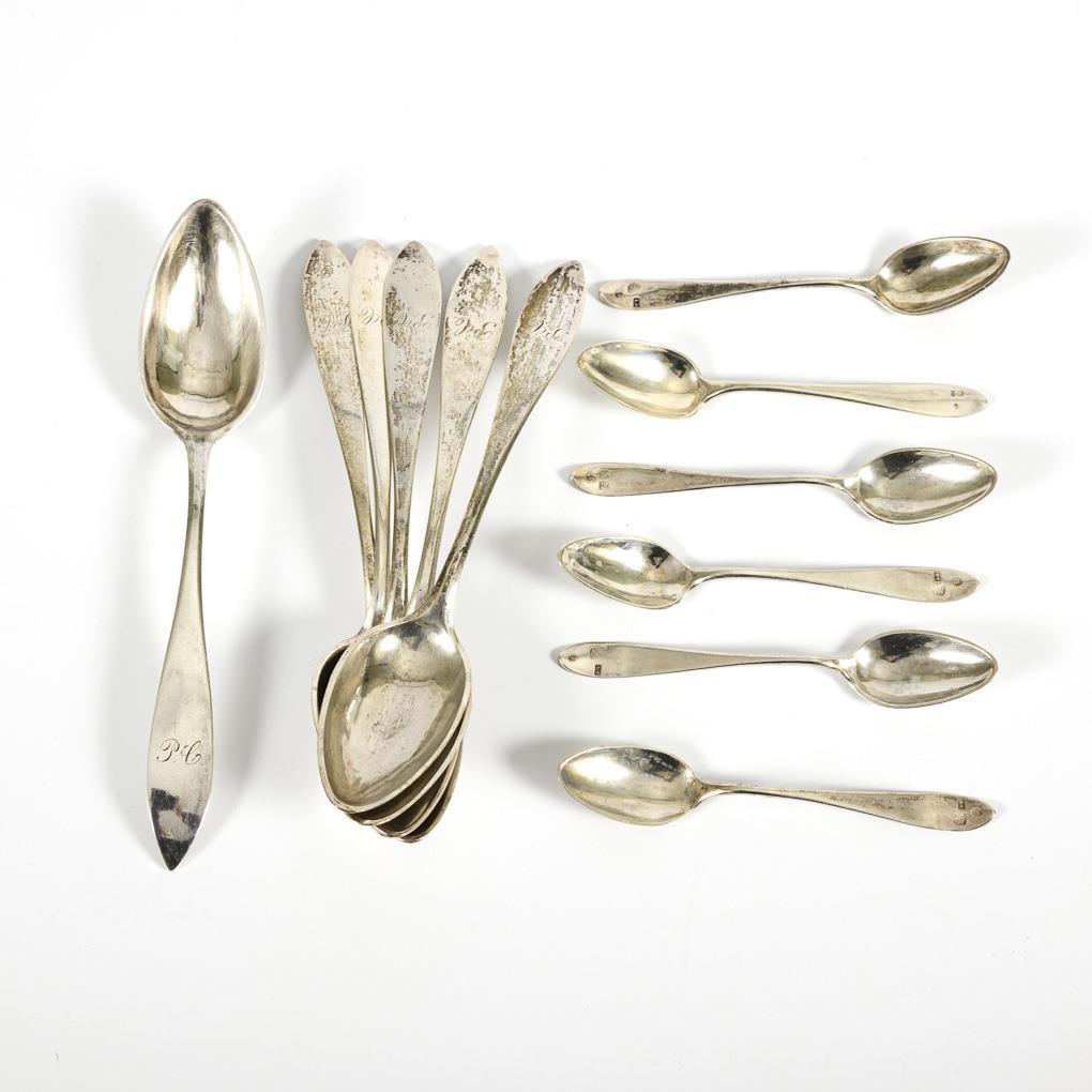 Alle mit spitzem Griffende und Monogrammgravur "PC": 6 Suppen- und 5 + 1 Kaffeelöffel. Gebrauchsspuren, 1 Kaffeelöffel jünger ergänzt.