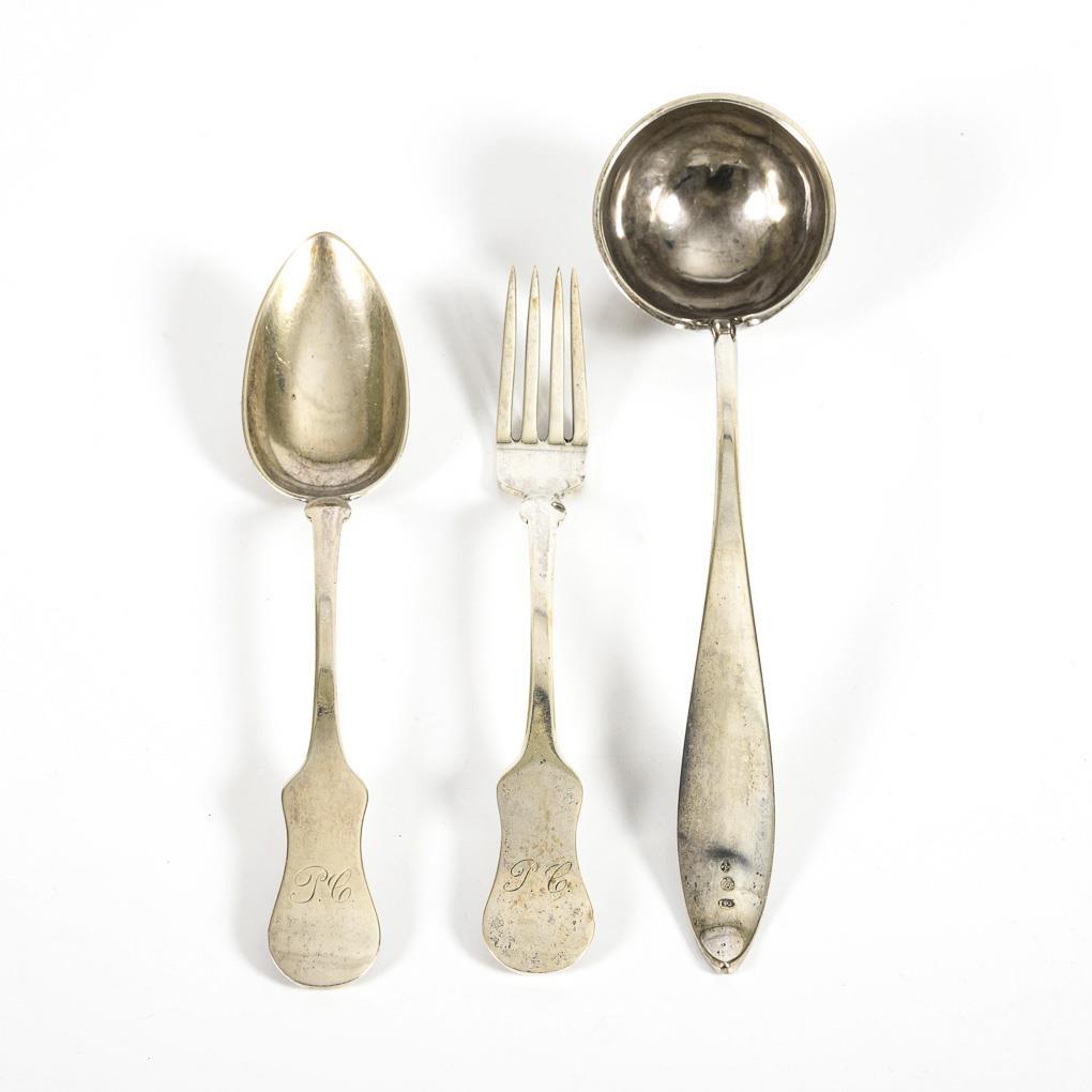 Alle mit Monogrammgravur "PC". Schlichte Suppenkelle (Prag 1817), L 32,5 cm. Vorlegelöffel, L 27,5 cm. Vorlegegabel, L 27 cm. Kelle mit 1 Delle.