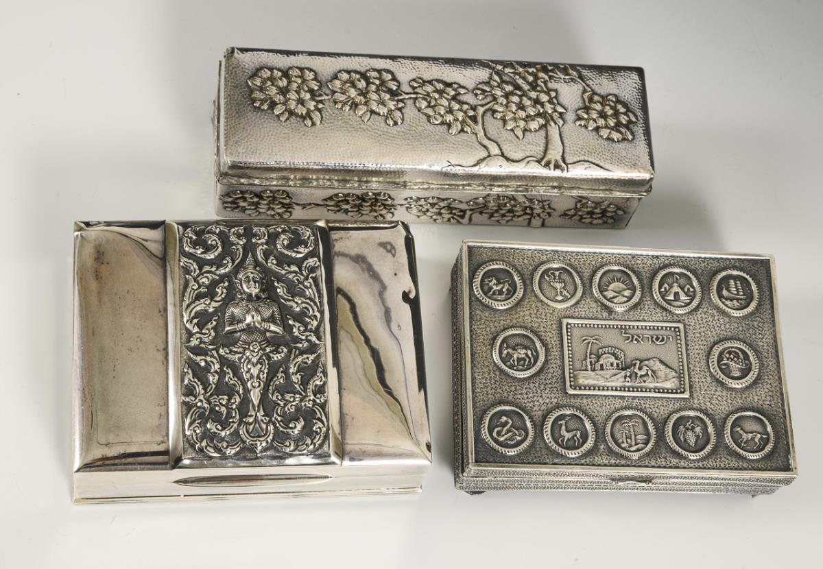 Asiatische Rechteckdose aus Holz, mit Silber beschlagen und mit Obstblüten reliefiert. L 15 cm./ Israelische Souvenir-Schatulle mit Reliefdeckel. L 11,5 cm. / Siamesische Dose mit gekröntem Buddha-Relief auf dem Deckel. L 11,5 cm. Stark gedellt.