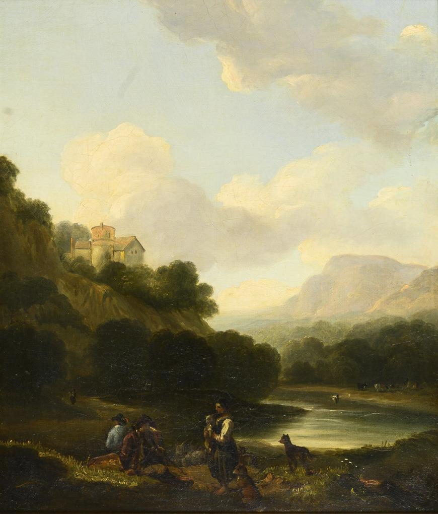 Mehrere Personen mit Vieh und Hunden am Ufer der Flussbiegung in bergiger Landschaft. Leichte Altersspuren.