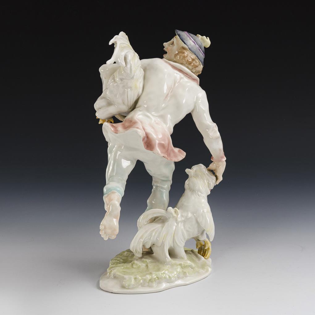 Über einen Natursockel laufender junger Mann mit zwei Hähnen.