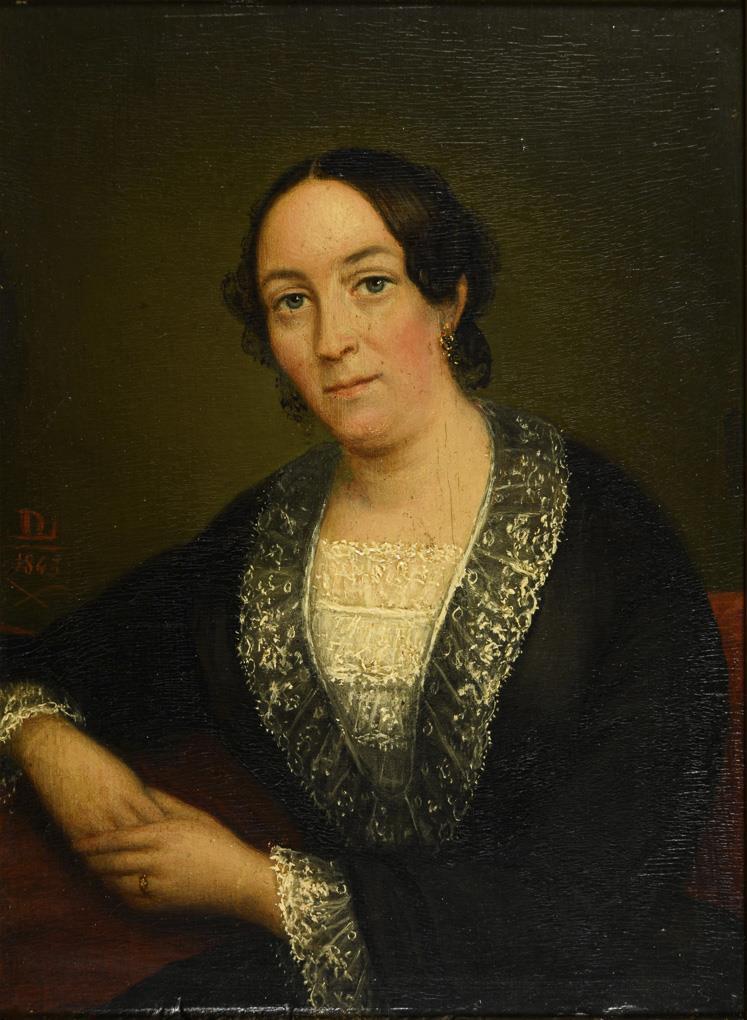Porträt einer Frau im schwarzen Kleid mit weißer Spitze vor neutralem Hintergrund. Leichte Altersspuren.