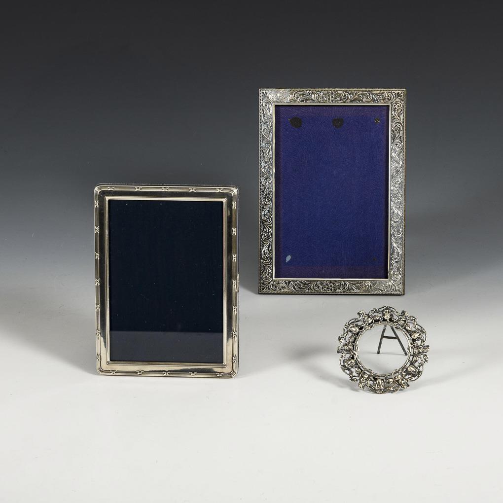 2 rechteckige Tischrahmen und kleiner runder Rahmen mit durchbrochenem Blütenrelief. Alle verglast, mit Standfuß.