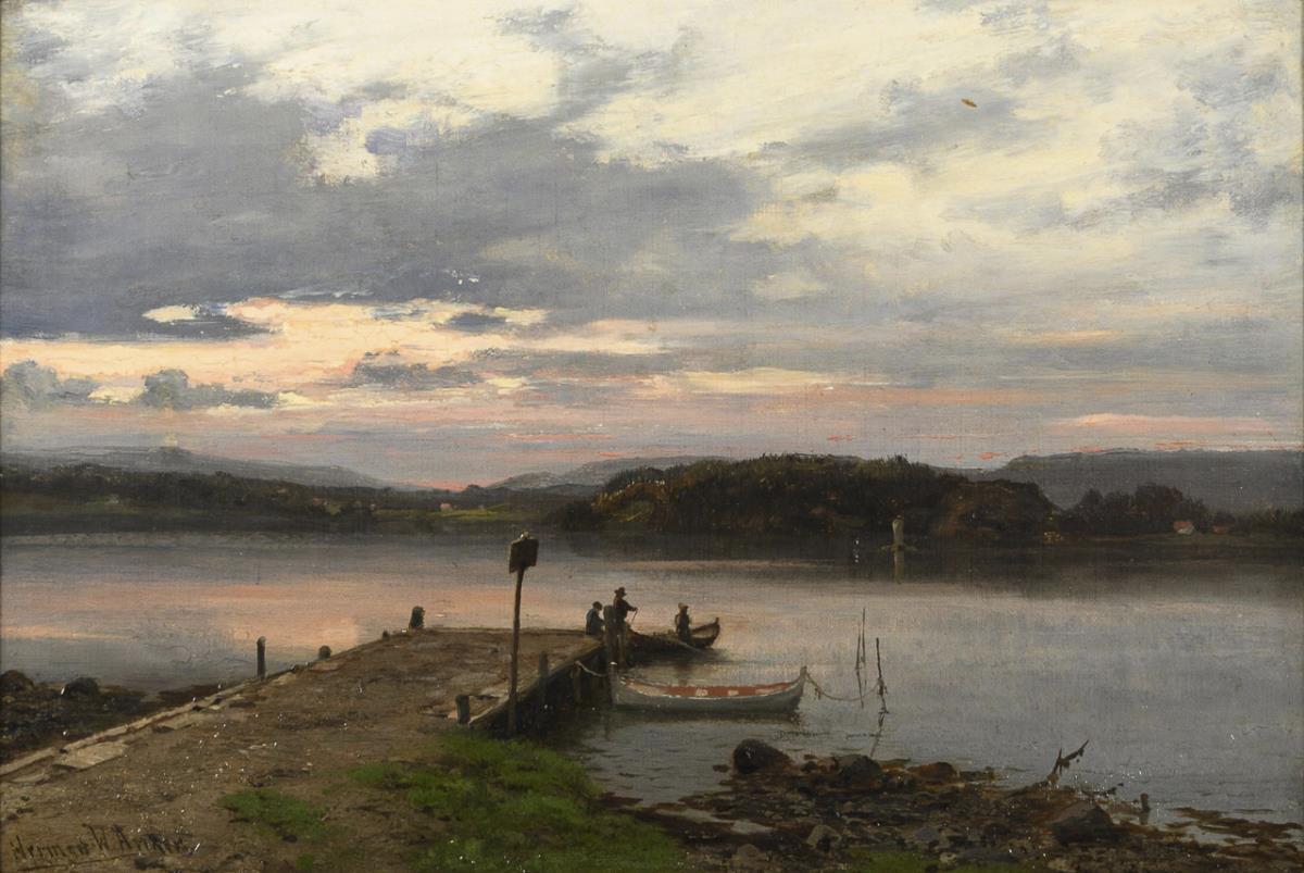 Staffagefiguren im Boot am Steg am Abend nach Sonnenuntergang. Leinwand randdoubliert.