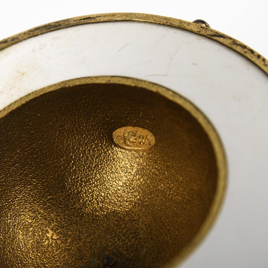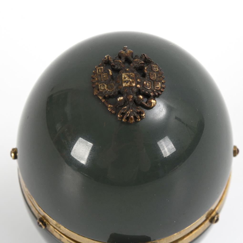 Als Dose gearbeitetes Ei mit appliziertem Adler, mit Jahreszahl bezeichnet "1861" auf der Schließe und 6 kleinen Granaten an der Montierung. Weiße Binnenringe um 2 habkugelförmige Höhlungen aus vergoldetem Silber. 1 weißer Innenring mit Haarriss, Fehlstelle an der Schließe.