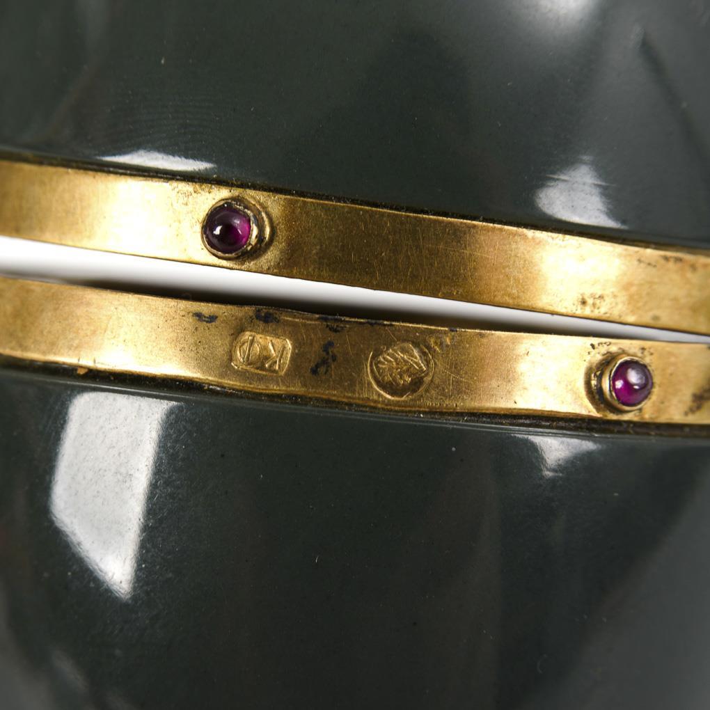 Olivgrüner Stein, Silber vergoldet, weißes Glas(?), Rubin-Cabochons. H 7 cm, Ø 5 cm.