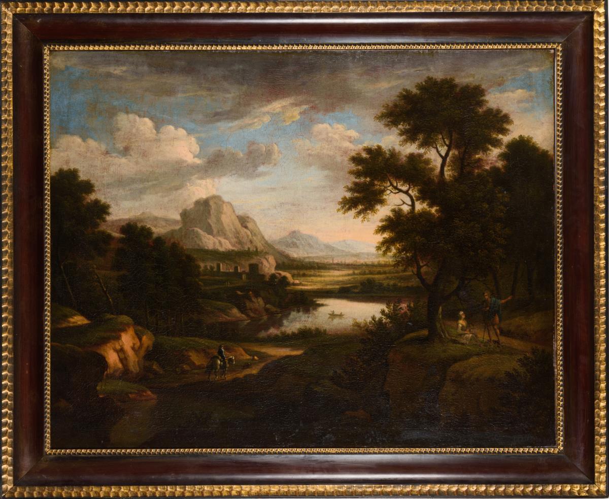 Weite Landschaft mit See nahe einer Ruine vor den Bergen und Staffagefiguren im Abendlicht. Leinwand doubliert.
