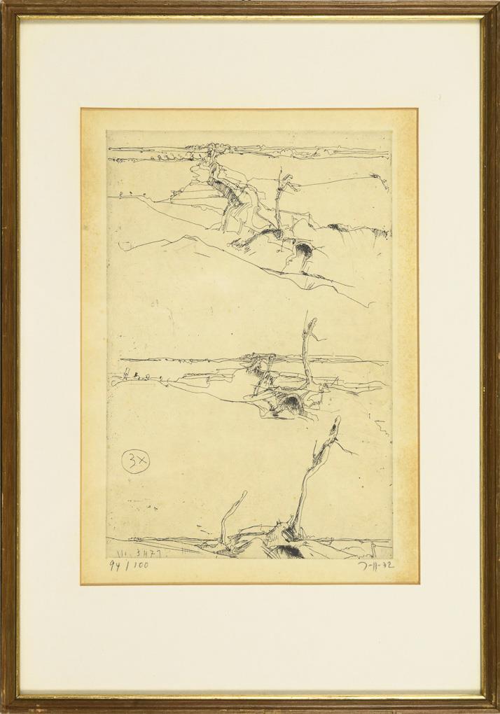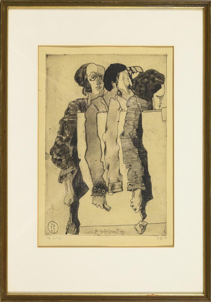 "1+1=3", [19]70, Exemplar: 7/10, Druckplatte: 13 x 16 cm, gerahmt & hinter Glas: 26 x 26 cm, Randbereich stark gebräunt | "Felix Metamorphose", [19]72, Exemplar: 8/100, Druckplatte: 12 x 10 cm, gerahmt & hinter Glas: 37 x 25,5 cm, Blatt etwas lichtgebräunt | "3x", [19]72, Exemplar: 94/100, Druckplatte: 22 x 15 cm, gerahmt & hinter Glas: 37 x 25,5 cm, Blatt etwas lichtgebräunt | "Griffelkunst Hbg", [19]71, Exemplar: 7/10 (radiert und überschrieben), Druckplatte: 22 x 15 cm, gerahmt & hinter Glas: 37 x 25,5 cm, Blatt etwas lichtgebräunt | "30.10.72", [19]72, Exemplar: 11/75, Druckplatte: 17,2 x 9 cm, gerahmt & hinter Glas: 37 x 25,5 cm, Randbereich stark gebräunt.