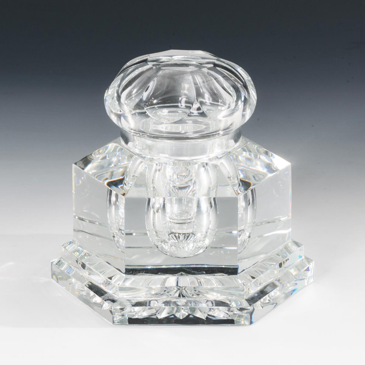 Schweres, sechseckiges Tintenfass mit Glaseinsatz und facettiertem Deckel.