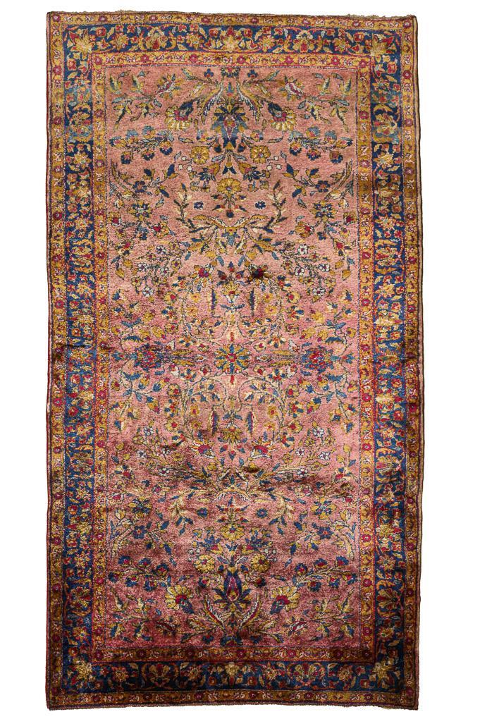 Roséfarbenes, floral gemustertes Mittelfeld mit verschiedenartigen Blumenzweigen. Dreireihige Bordüre mit Blumenranken. Rückseitig Ösen zur Aufhängung. Defekte Fransenabschlüsse repariert, wohl ergänzte rote Kantenumwicklung.