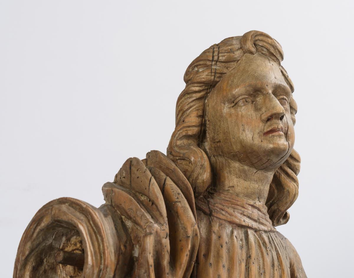 Stehender Engel mit ausgebreiteten Armen und bewegter, voluminöser Fältelung am langen Gewand. Rückseitig ist die Steckmontierung der Flügel erkennbar. Fassung entfernt, Trockenrisse, Anobienspuren, Unterarme fehlen, 1 Fußspitze ergänzt, 1 Stelle der Plinthe angebrochen.
