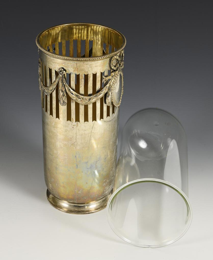 Hoher schlanker Silberkorpus mit durchbrochener Wandung und Girlandenrelief. Gebrauchsspuren, Glas mit Randbestoßung.