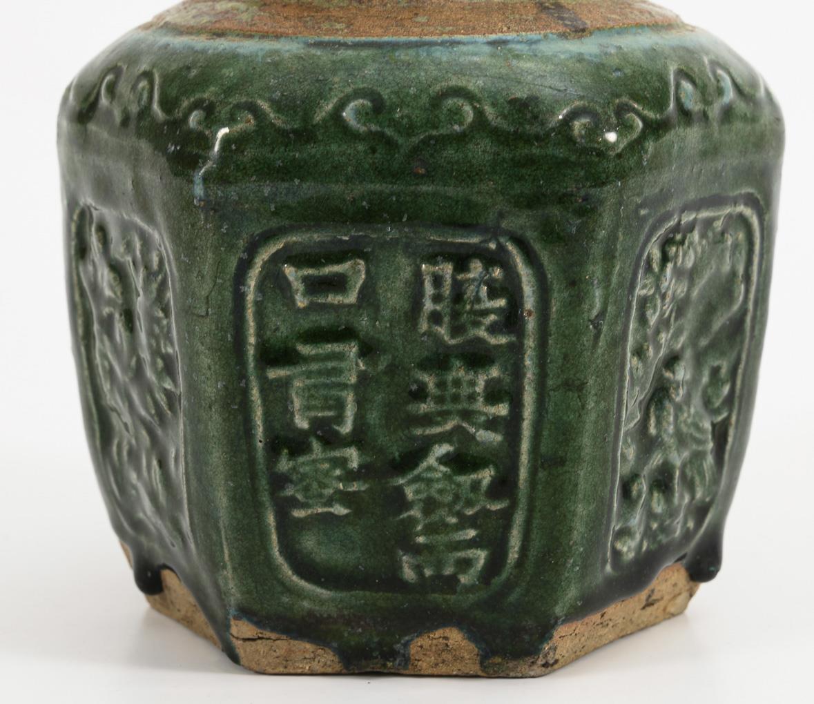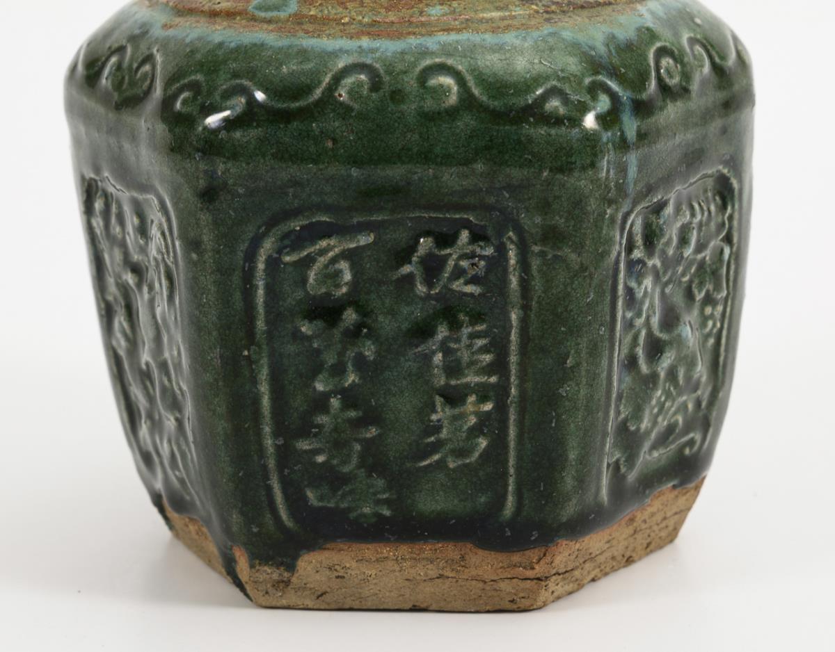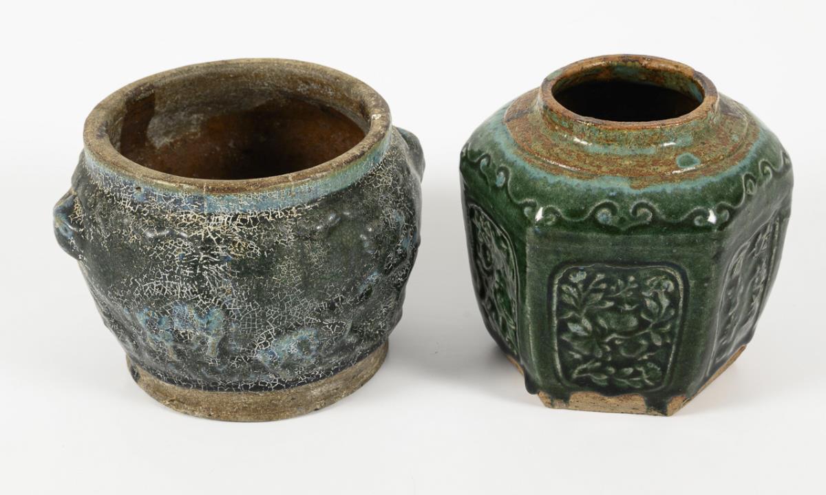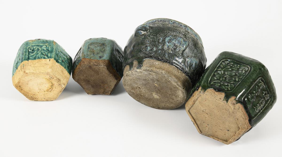 Runder Topf mit kleinen Handhaben und dicker, krakelierter Glasur. H 11,5 cm. / 3 sechspassige Gefäße mit unterschiedlichen grünen Glasuren, nur teilweise glasiert, Ornamente wohl geprägt. H 9, 10, 13 cm.