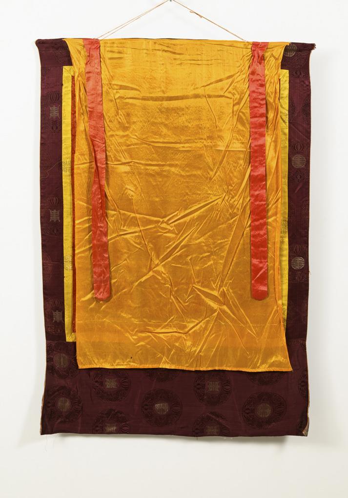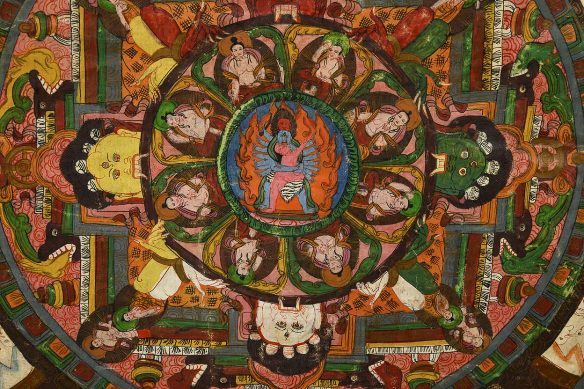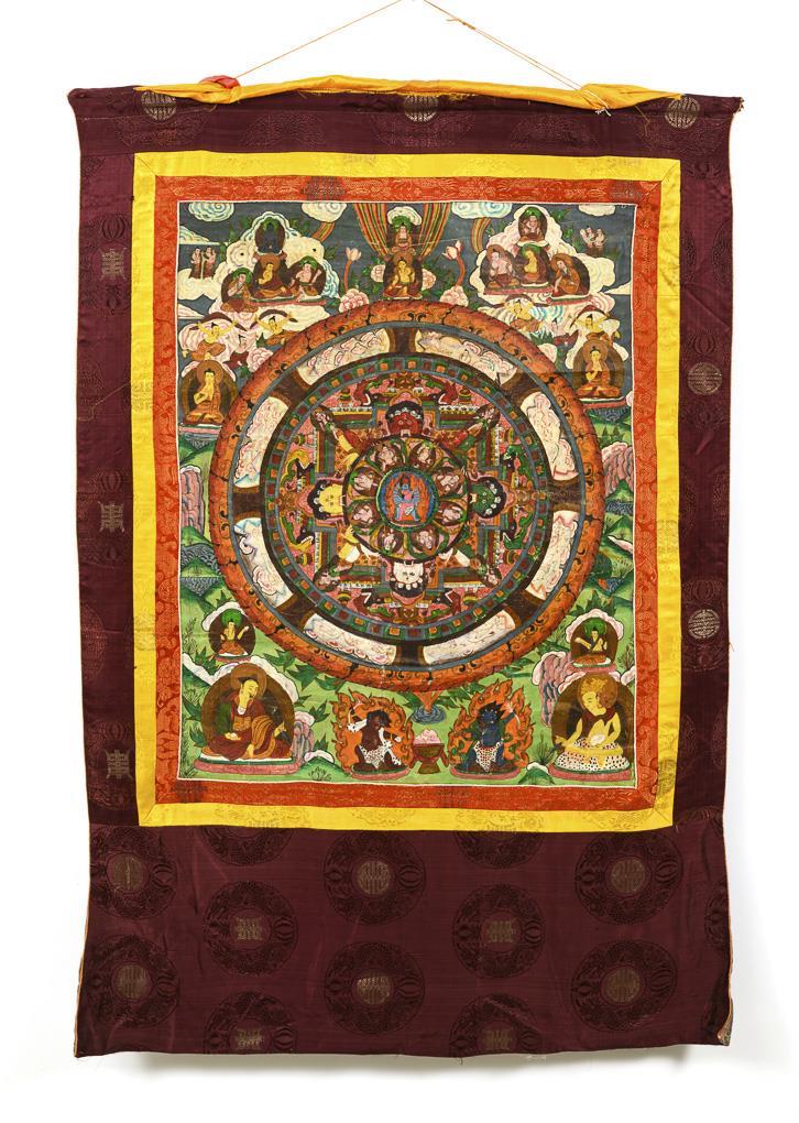 Mandala mit Yamantaka und Vajravetali im Zentrum, umgeben von zahlreichen Buddhas und Dämonen. Eingefasst von weinrotem Seidenstoff mit Schriftzeichen.