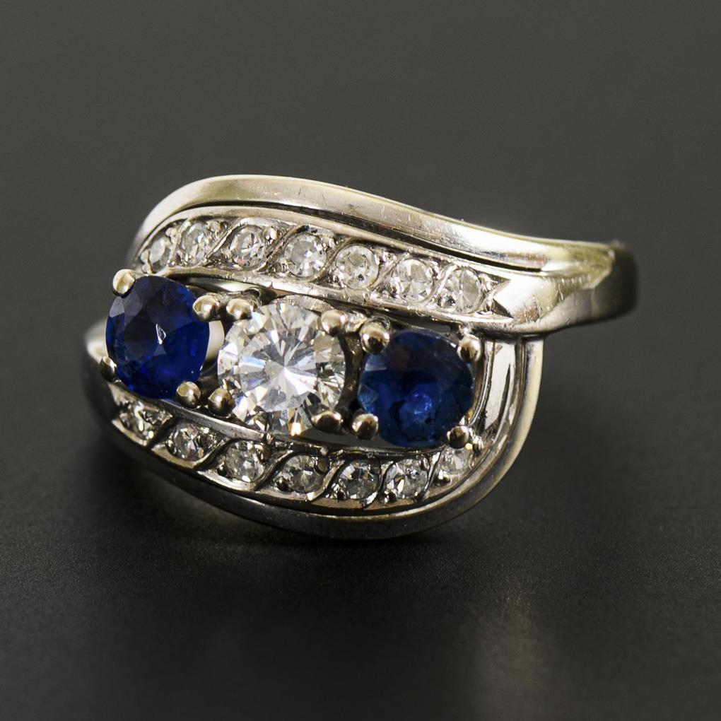 Weißgold 585 gestempelt. Saphire zus. ca. 0,82 ct. Brillant ca. 0,52 ct/Weiß/vs2. Diamanten zus. ca. 0,42 ct/Weiß/vvs-vs. Ringgröße 57. 7,8 g.