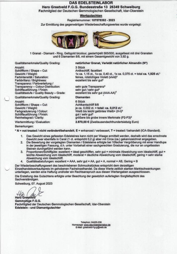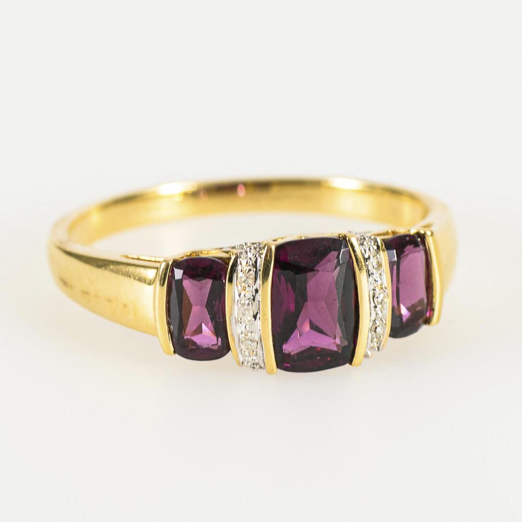 Gelbgold 585 gestempelt. Granate zus. ca. 1,925 ct. Diamanten zus. ca. 0,012 ct/H-I/PII-III. Ringgröße 66. 3,9 g.