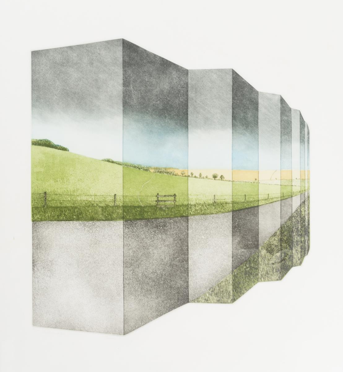 Optische Täuschung in Form einer gefalteten Druckplatte mit Darstellung eines Weges in der südostenglischen Landschaft Chiltern bei Gewitterstimmung.