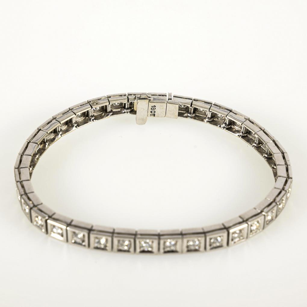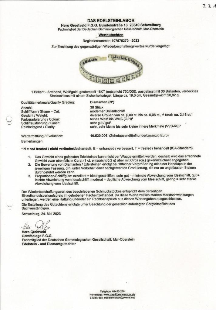 Weißgold 18 CT gestempelt. Brillanten von ca. 0,08 ct- ca.0,09 ct. Zus. ca. 3,16 ct/G-H/vvs-vs. 18,5 x 0,5 cm. 20,9 g.