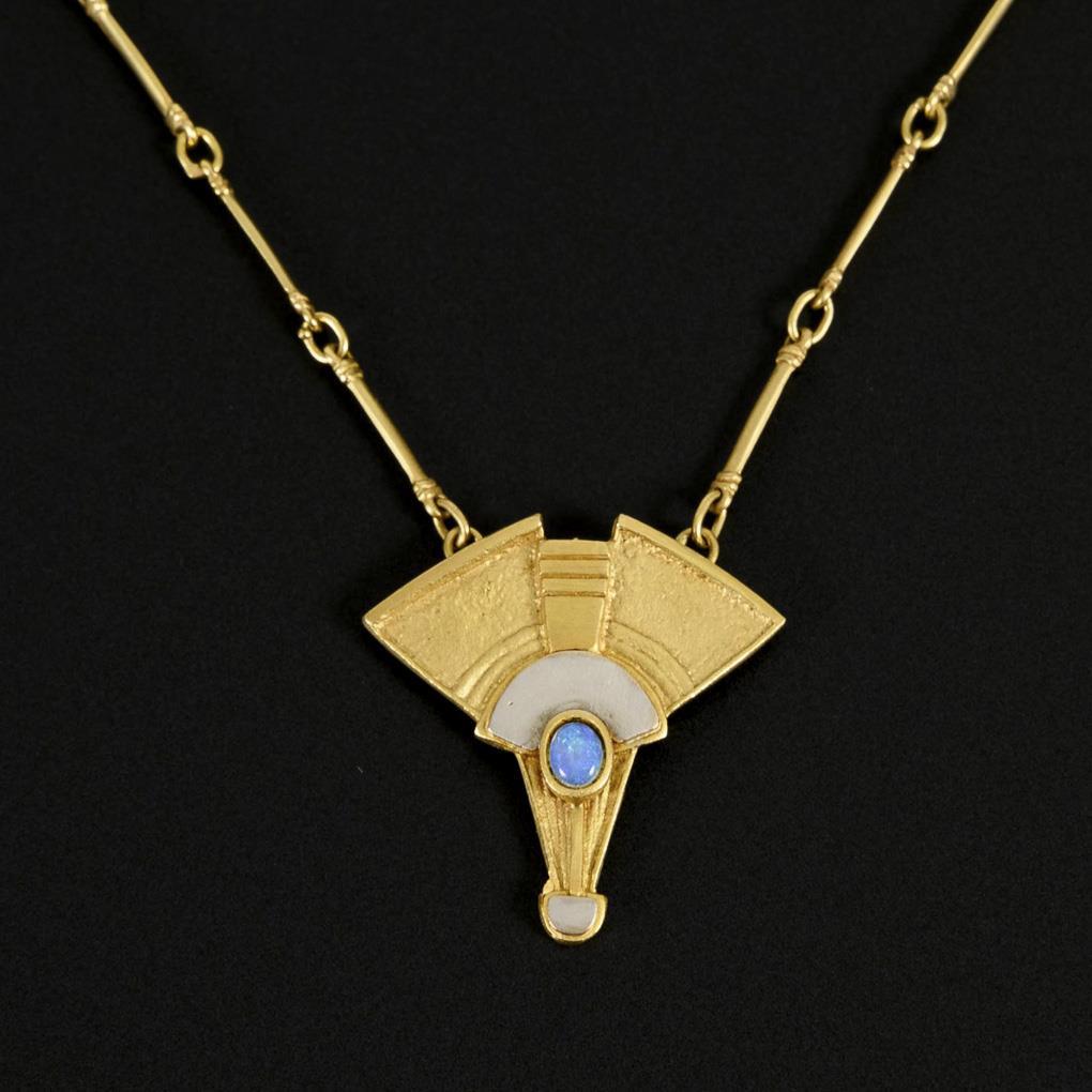 Geometrisch gestalteter Anhänger mit zargengefasstem Opalcabochon, zwischen Stabgliederkette mit Karabinerschließe.
