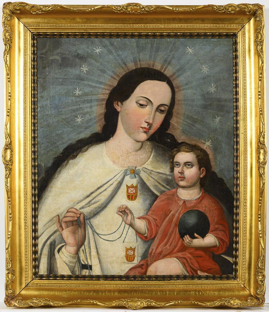 Maria mit Sternennimbus und dem Jesusknaben auf dem Schoß. Leinwand doubliert.
