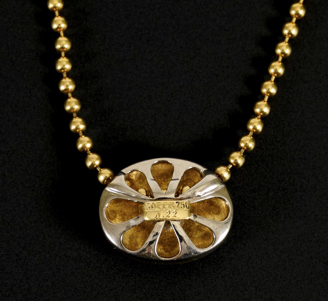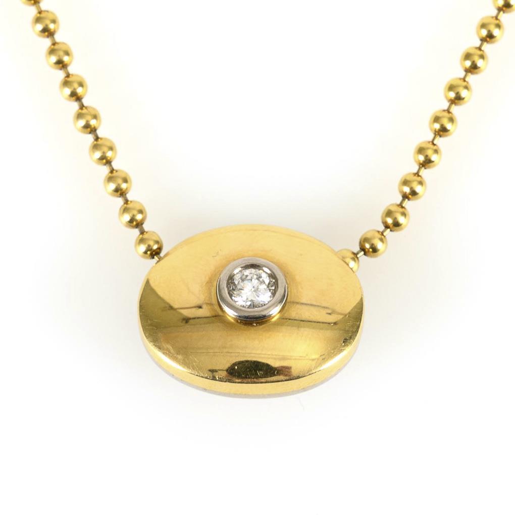 Anhänger mit zargengefasstem Brillant und durchbrochener Rückseite, an Kugelkette mit Karabinerschließe.