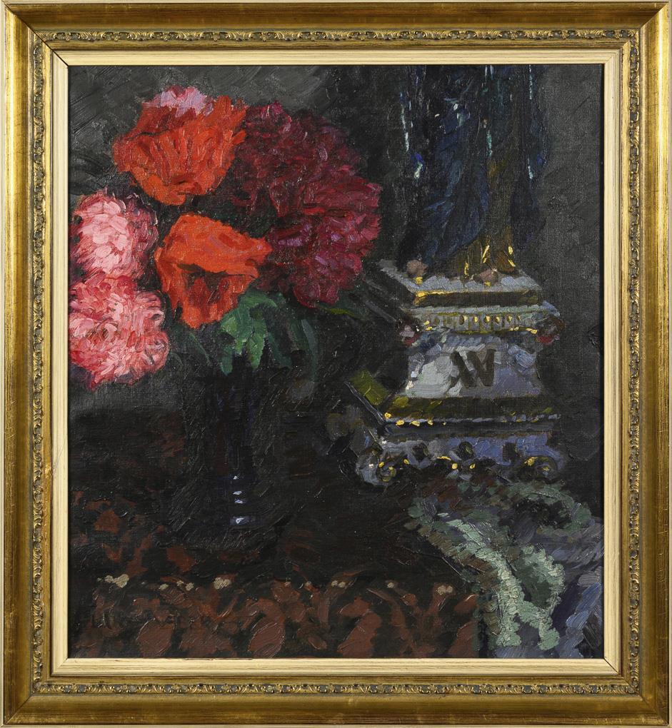 Blumenstrauß mit roten Blüten neben Porzellanfigur. Leichte Altersspuren.