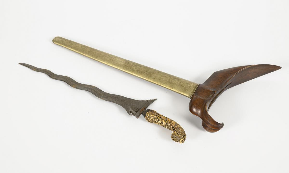 Keris Luk 9. Gewellte Klinge mit schönem Streifenpamor und ausgeprägten prabot-Merkmalen. Mendak aus Silber, fein beschnitzter Griff. Holzscheide mit pendak topengan ungemustert.
