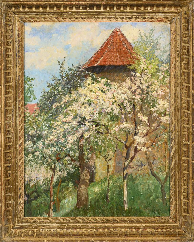 Blütenreiche junge Bäume vor dem Turm im Sonnenschein.
