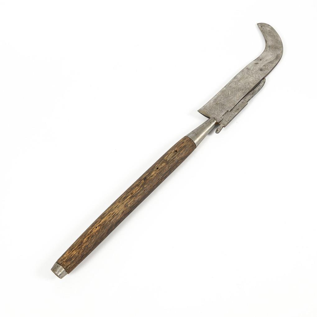 Breite Eisenklinge mit Schliff auf der Innenseite. Ziselierte Fabelwesen bzw. geätzte Ornamentkante auf der Klinge. Holzgriff.