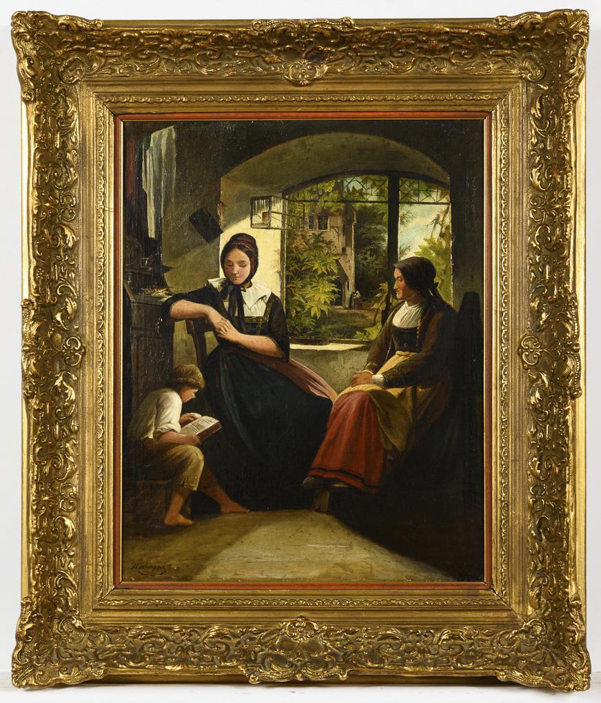 Genreszene mit zwei Frauen und einem lesenden Jungen am geöffneten Fenster. Altersspuren.