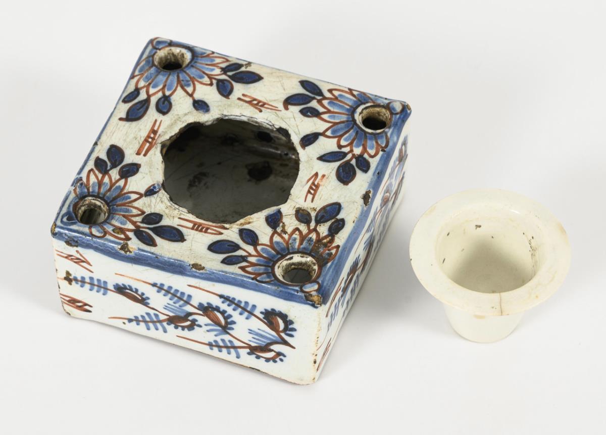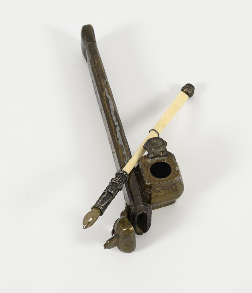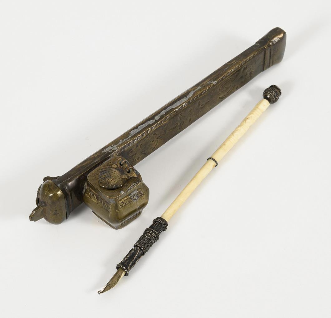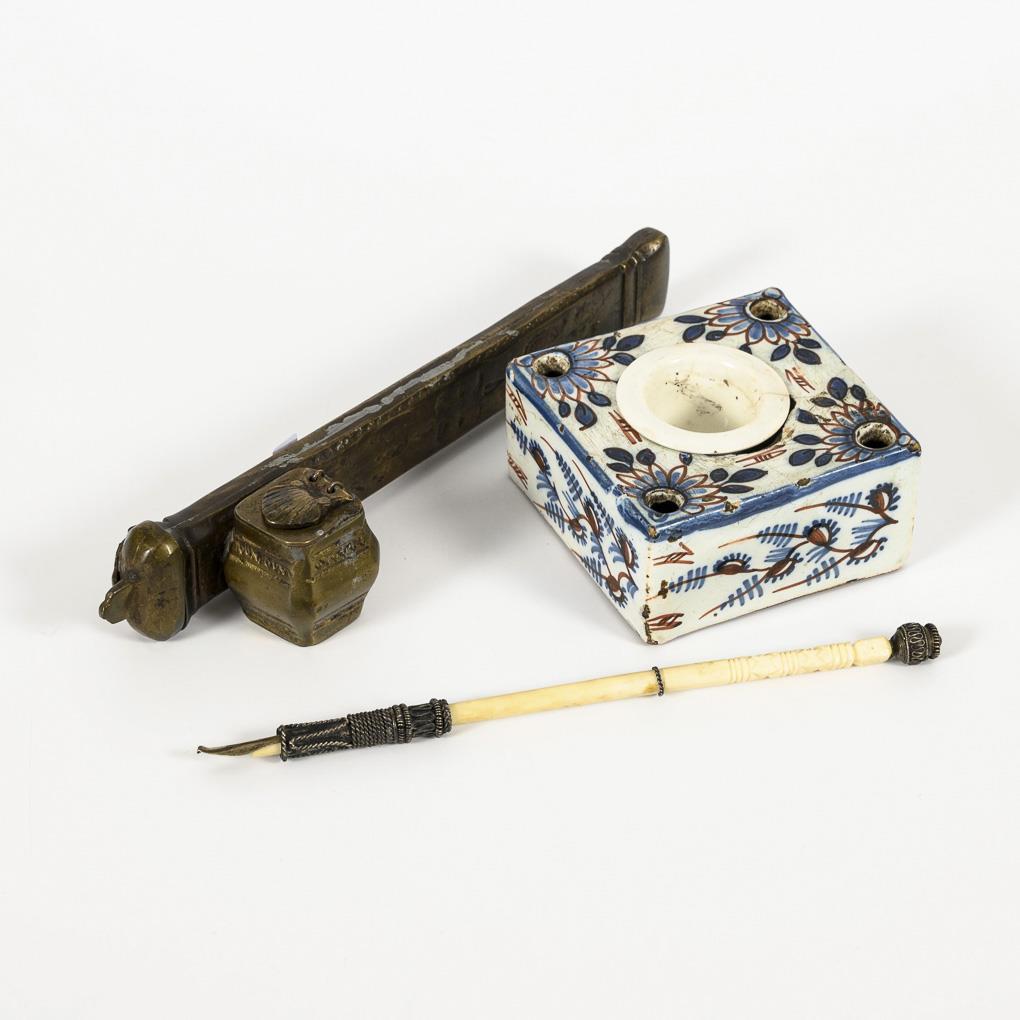 Keramik-Tintenfass mit Unterglasur-Blaumalerei und roter Bemalung. Vier kleine Löcher in den Ecken. Einsatz wohl ergänzt. 4 x 8,5 x 9 cm, Altersspuren. / Metall-Etui für Schreibfedern und Tinte, mit beriebenen Ornamenten. L 22,5 cm. / Schreibfeder mit Silberfassung, Schaft wohl aus Bein(?). L 20,5 cm .