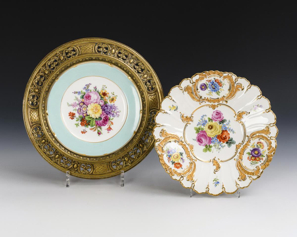 1x Meissen, 2. H. 20. Jh., 2 Schleifstriche: Prunkteller mit Goldbronzierung und Blumenmalerei (Ø 23,5 cm). / 1x KPM Berlin, Zeptermarke und Pfennigmarke, 1849-1870: glatter Teller mit türkisfarbener Fahne, Blumenmalerei und durchbrochenem Messingrahmen (Ø 27 cm).
