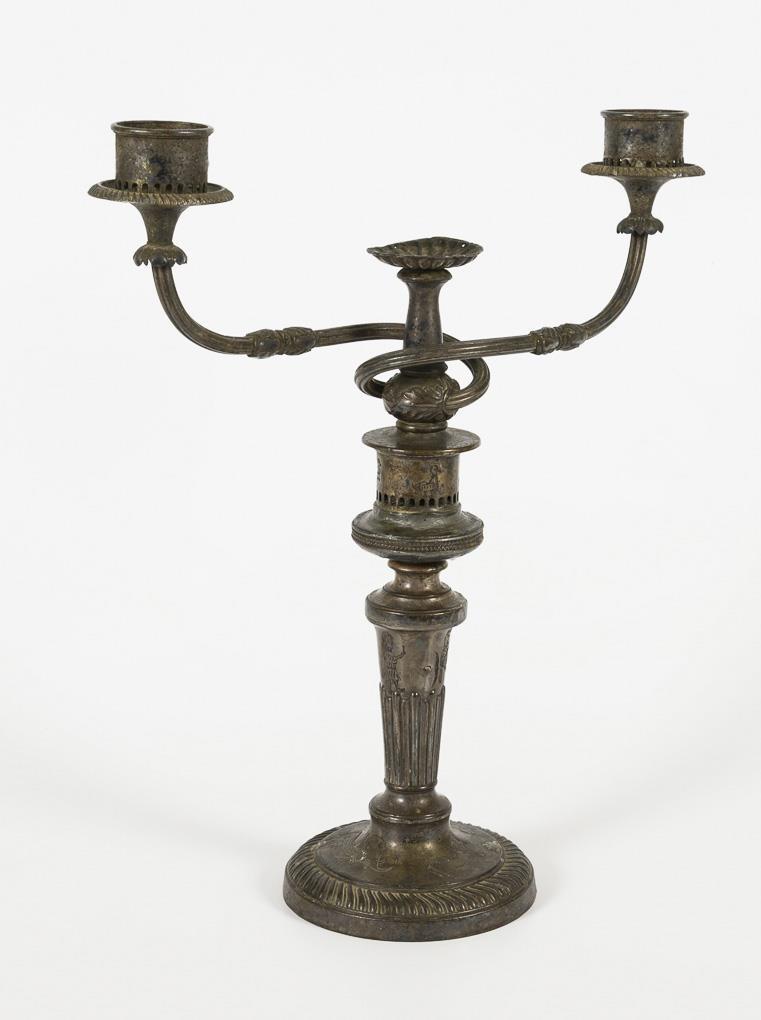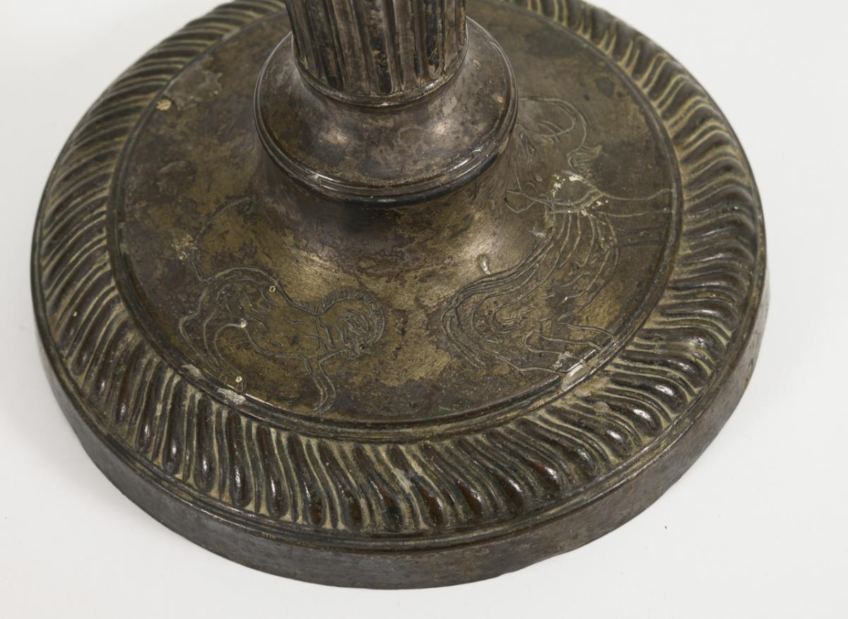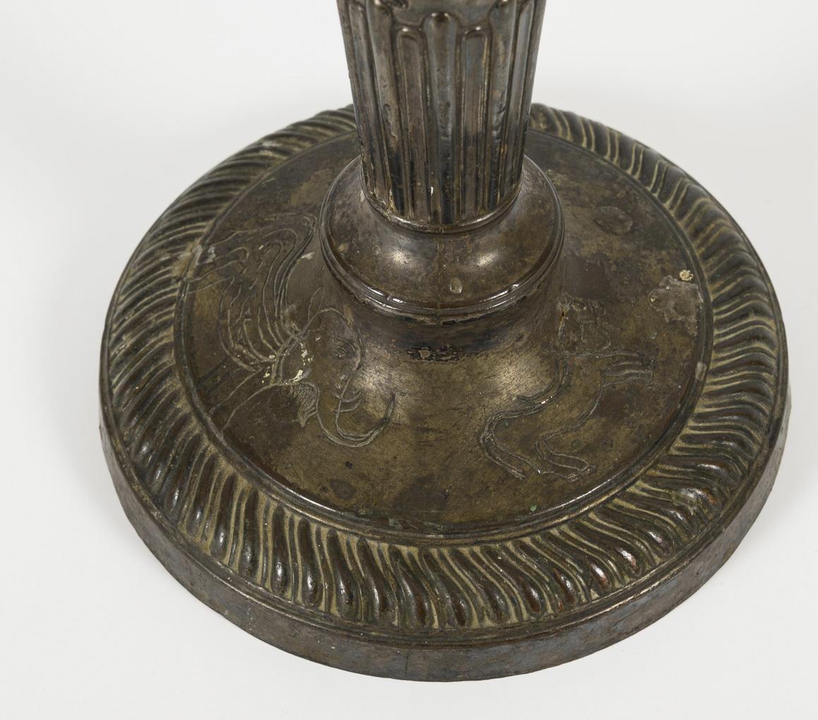 Wohl nach europäischem Vorbild in Afghanistan gefertigt, mit Abwandlungen wie z. B. bildliche Gravuren und sehr große Tüllen. Fuß mit Eisenplatte verschlossen. Lötstellen am Nodus.