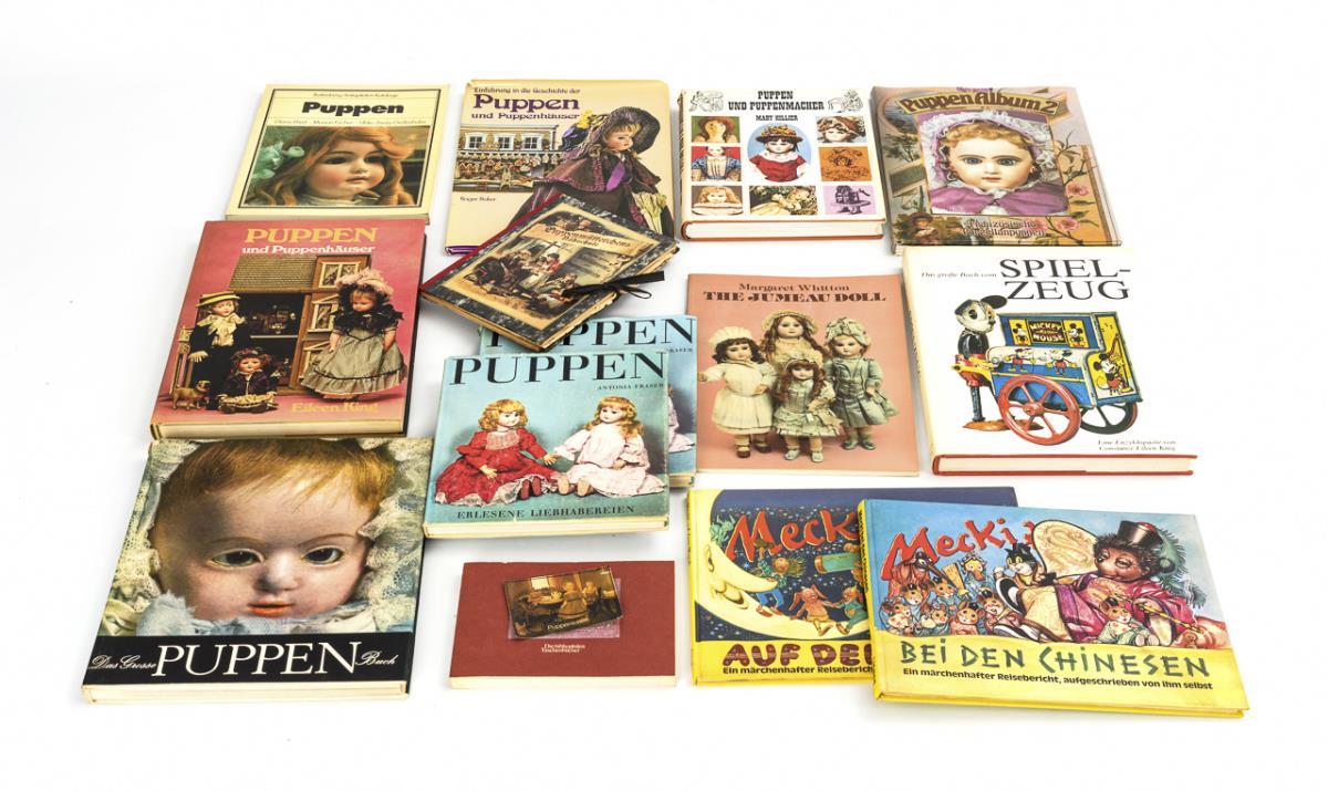 Elke Dröscher, Puppenleben. / Reprint "Puppenmütterchens Nähschule". / "Mecki bei den Chinesen". / "Mecki auf dem Mond". / 2x Antonia Fraser, Puppen. Erlesene Liebhabereien". / Margaret Whitton, The Jumeau Doll. / Bachmann und Hansmann, Das grosse Puppenbuch. / Eileen King, Puppen und Puppenhäuser. / Gloria Ehret u.a., Puppen. Battenberg Antiquitäten-Kataloge. / Mary Hillier, Puppen und Puppenmacher. / Roger Baker, Einführung in die Geschichte der Puppen und Puppenhäuser. / Constance E. King, Das große Buch vom Spielzeug. / Lydia Richter, Französische Porzellanpuppen. Teils leichte Alters- und Gebrauchsspuren.