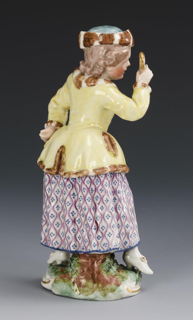 "Kleine Polin". Auf einem Natursockel stehendes Mädchen mit Pelzjacke, durch eine Lupe schauend.