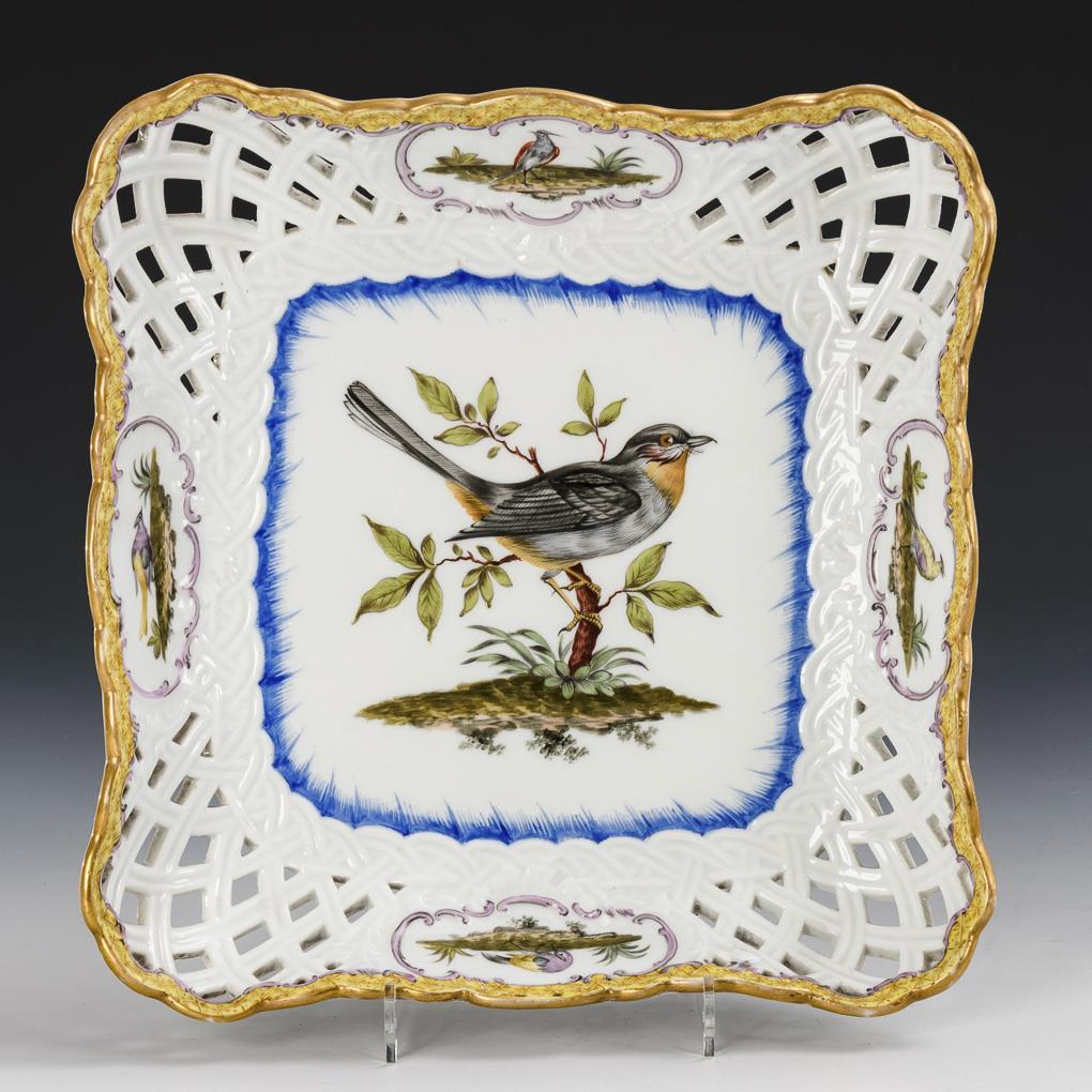 Quadratische Schale mit korbdurchbrochener Fahne. Im Spiegel sowie in vier Rocailleschildern die Darstellung von Vögeln auf einer Landschaftsinsel. Minimaler Goldabrieb am Rand.