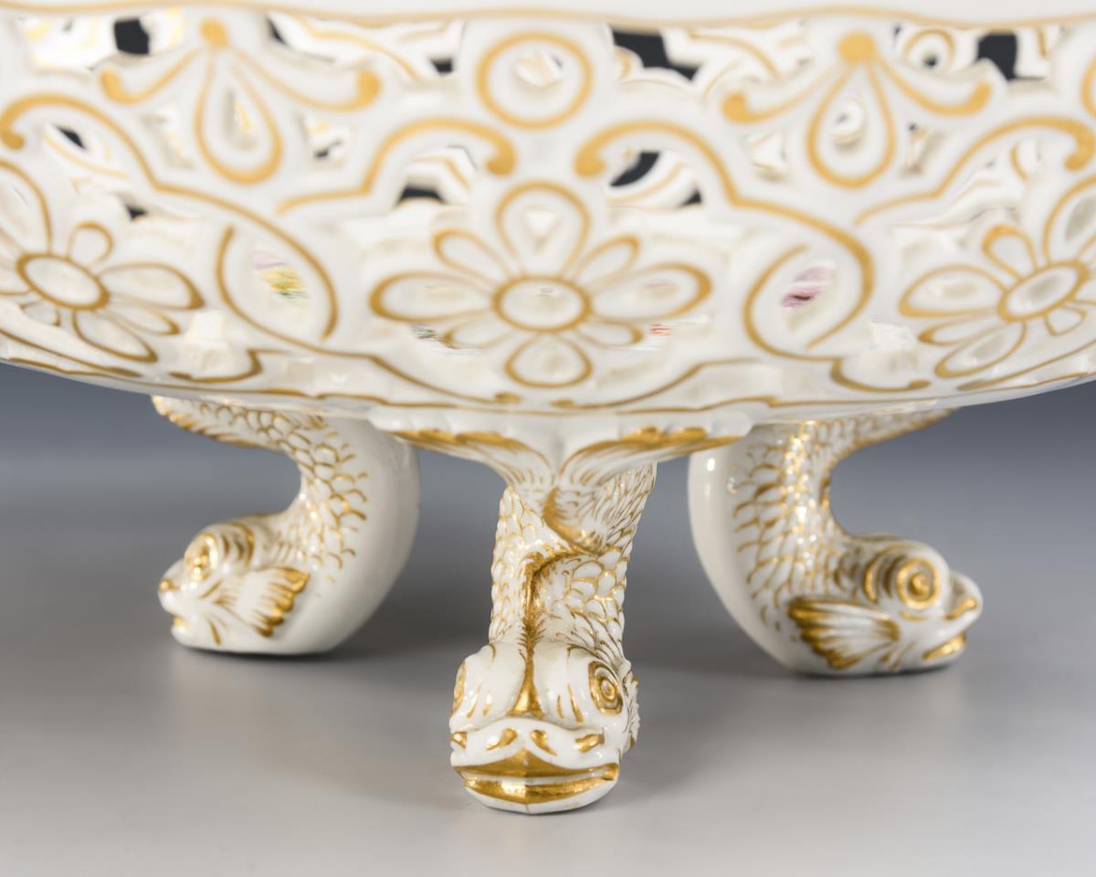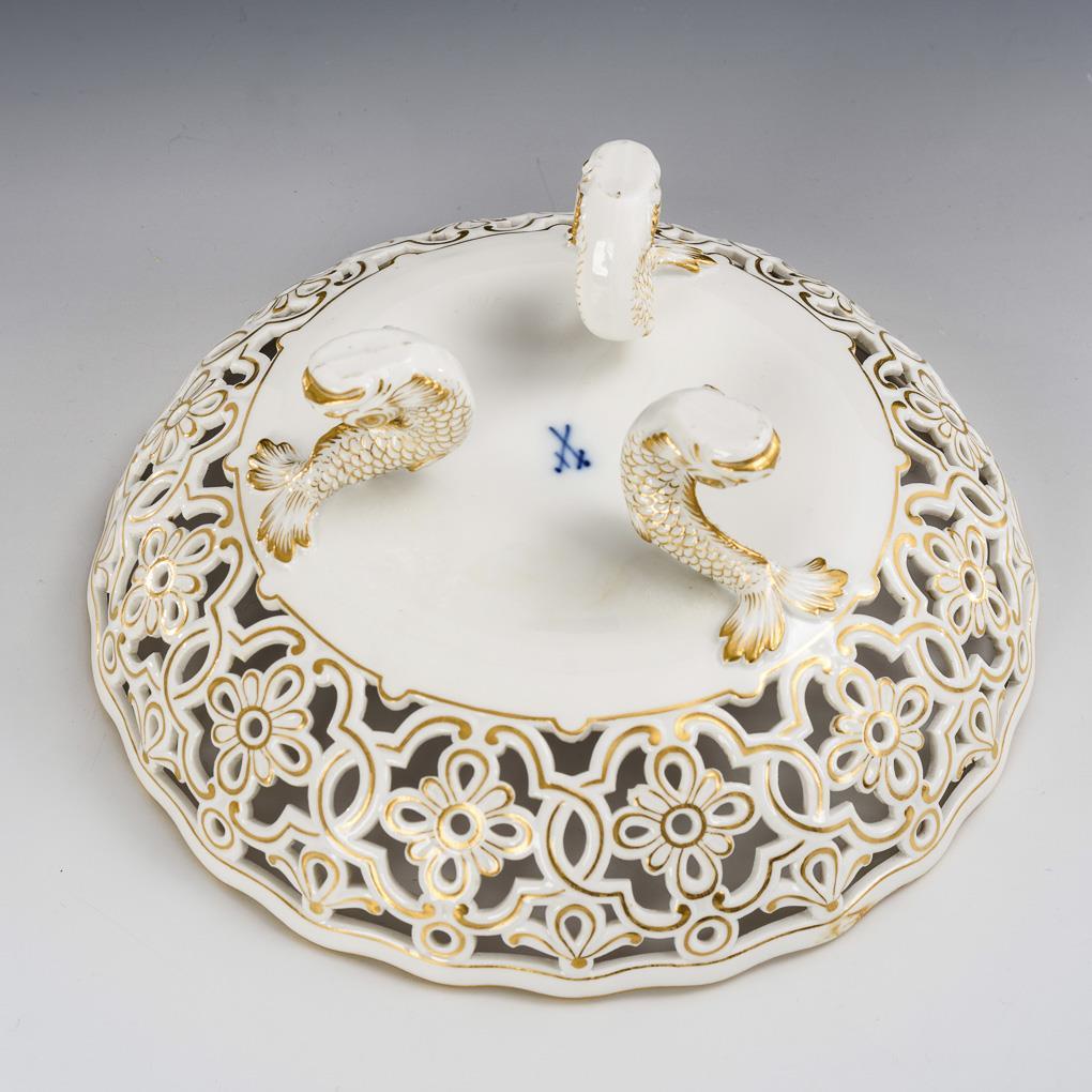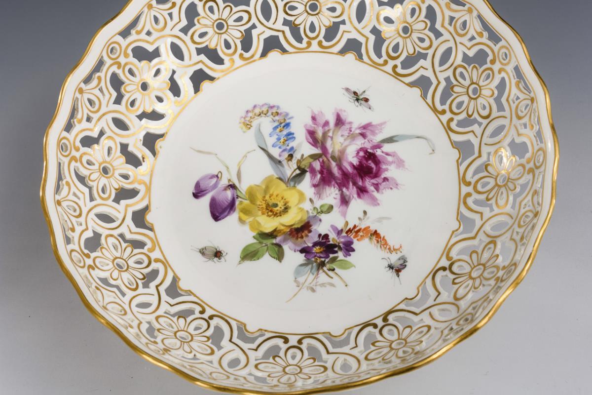Schale mit Blütendurchbruch und drei Delfinfüßen. Im Spiegel die Darstellung eines Blumenbuketts mit Insekten. 1 Randhaarriss.